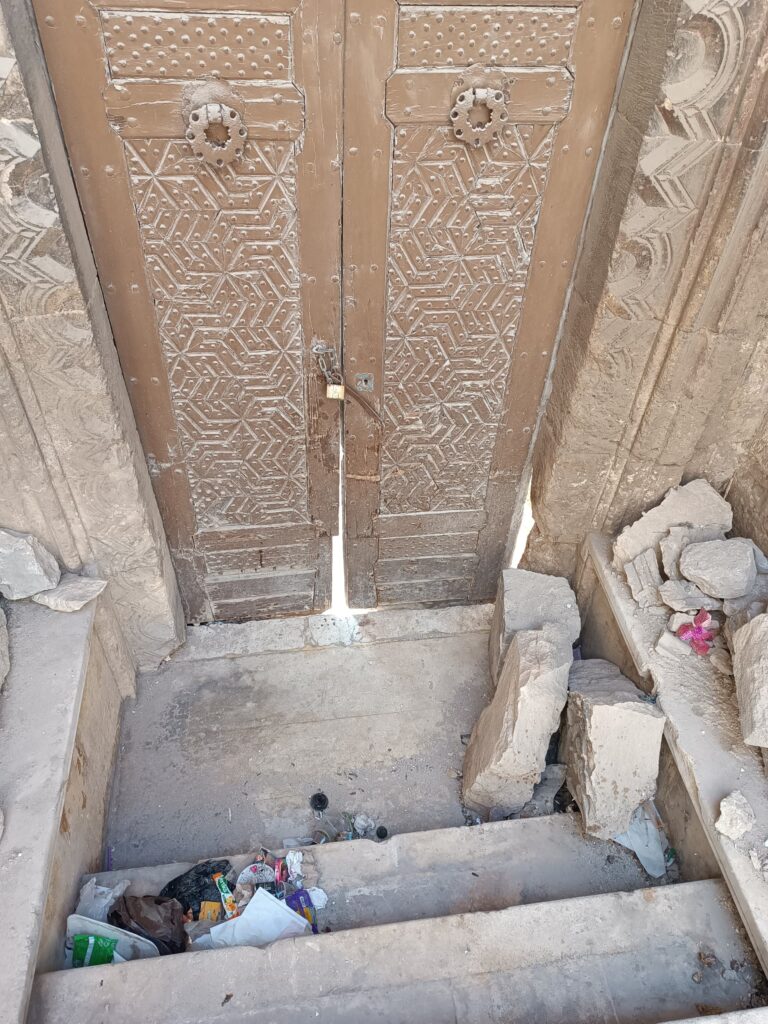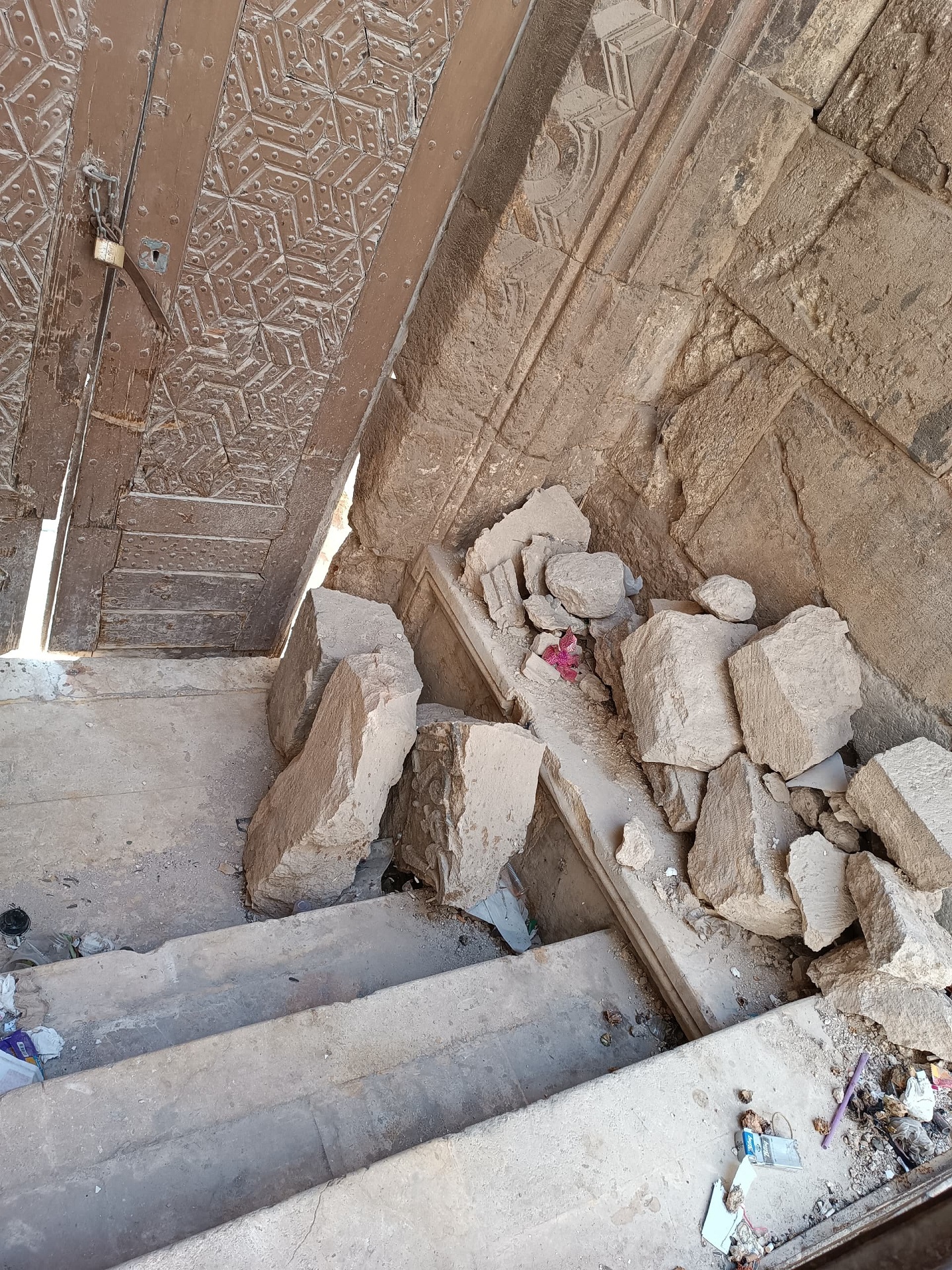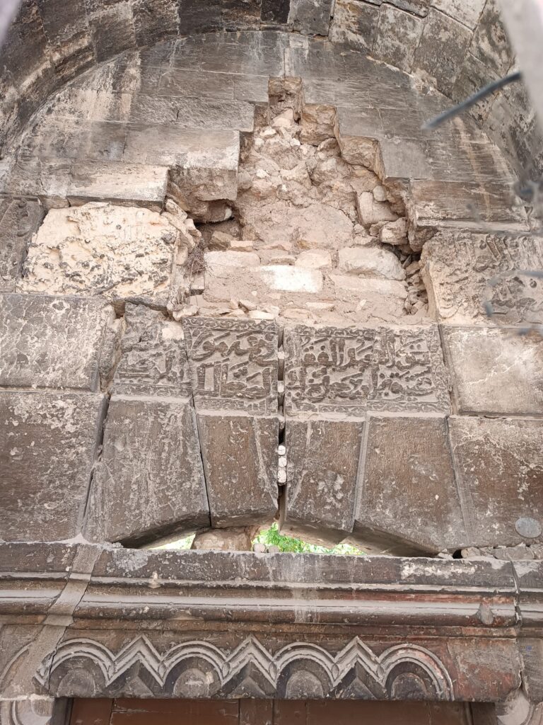 استكمالاً لمهامنا في توثيق الانتهاكات بحق التراث المعماري، وتسليط الضوء عليها بهدف حماية هذا التراث، تم توثيق حالة من الإهمال بحق التراث المعماري في حي الجلوم بحلب، وذلك بتاريخ 1 آب 2025، ويأتي ذلك نتيجة الزلزال المدمر الذي ضرب مدينة حلب في صباح يوم 6 شباط 2023، حيث سقطت قطعة حجرية تضم جزء من النص الكتابي التأسيسي للبيمارستان النوري أمام المدخل مما أدى لتكسرها إلى عدة أجزاء مع تضرر حروف النص الكتابي.