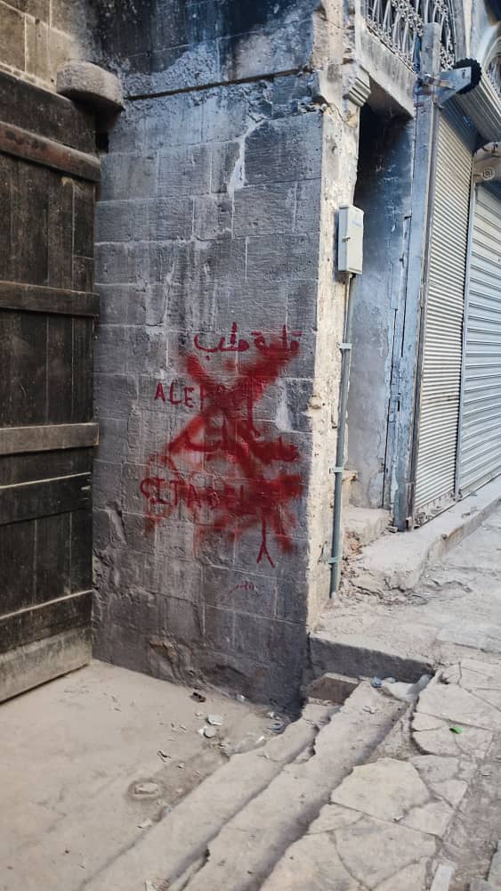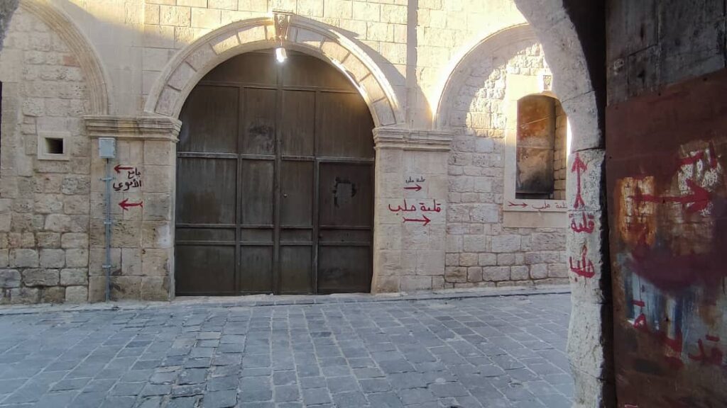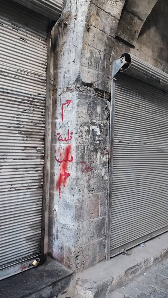 في إطار متابعة جهود مرصد انتهاكات التراث المعماري في رصد ما يطرأ على تراثنا المعماري، وضمن المتابعة المستمرة لحماية المباني التاريخية في مدينة حلب القديمة، تم بتاريخ 20-9-2025 توثيق حالة تشويه بصري في محيط خان خير بك، وذلك من خلال انتشار كتابات وإشارات تعبيرية على الجدران والأعمدة والمداخل .